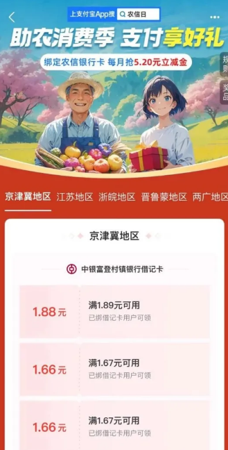 ①支付宝农信日领5.2元消费红包,支付宝搜索“农信日”->有农信的可以领自己对应地区的消费红包,每个月都可以领(农金、农商行)